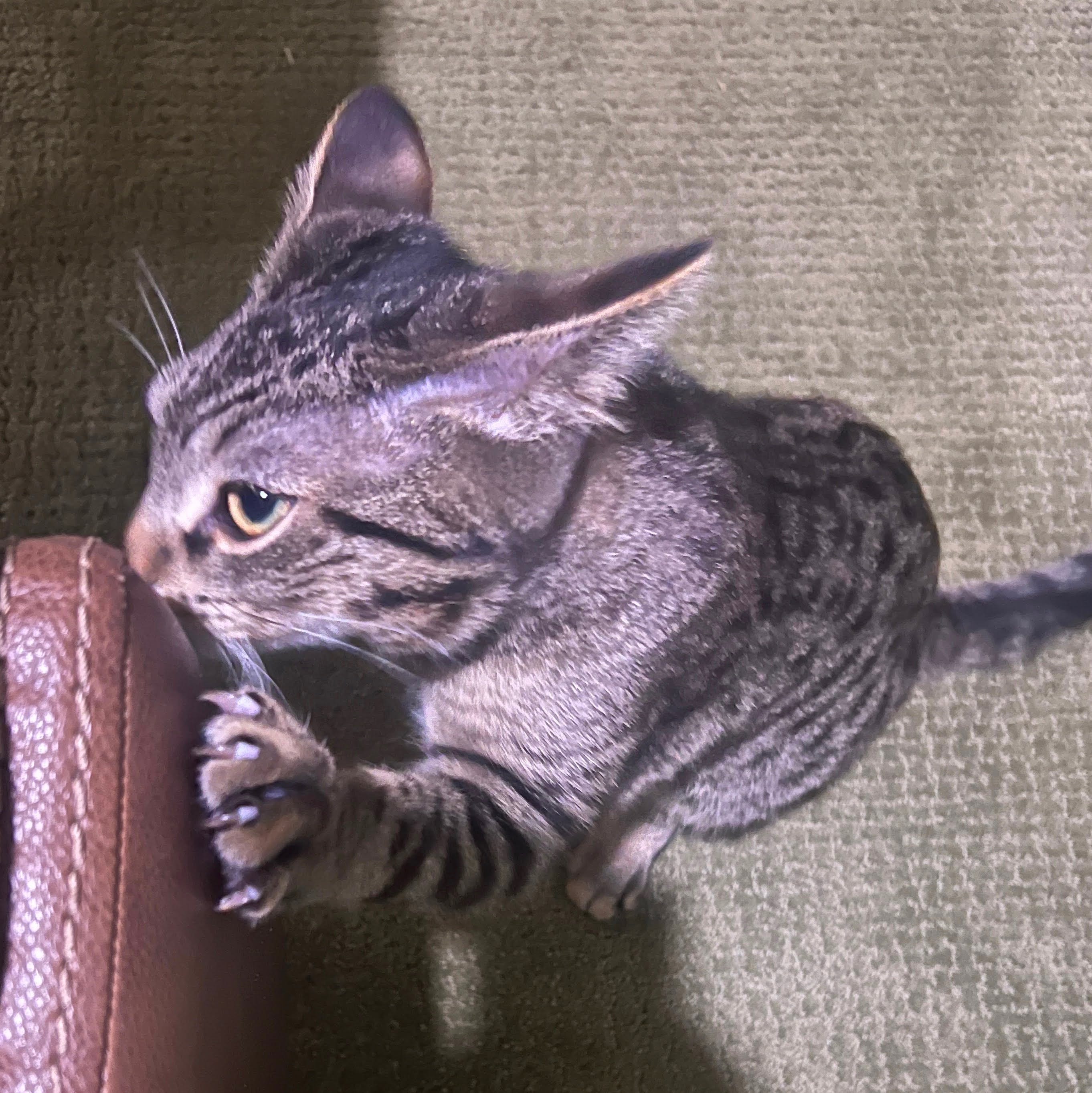 We searched for him, and after a long while, found him hanging out under Mr. Krupp’s (Joe’s dad) bed. He still had the loop around his neck, but most of the bag was gone.