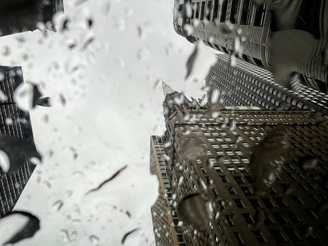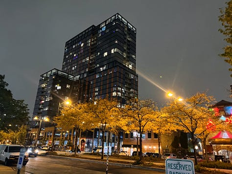 The skyline looks like something out of a cyberpunk film. A dense cluster of dark skyscrapers lit from within, their top floors buried in fog. The city lights glow against the underbelly of thick clouds, recalling the opening line from Gibson’s Neuromancer: