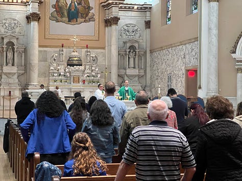 In the morning, I decide to try heading to Sunday Mass again. I hadn’t planned on it the night before, but something tells me I should go. I shower and dress and head over to the church. The only access from within the rectory is through the sacristy, but Mass has already started, so I walk outside through the rain and go in the main entrance.