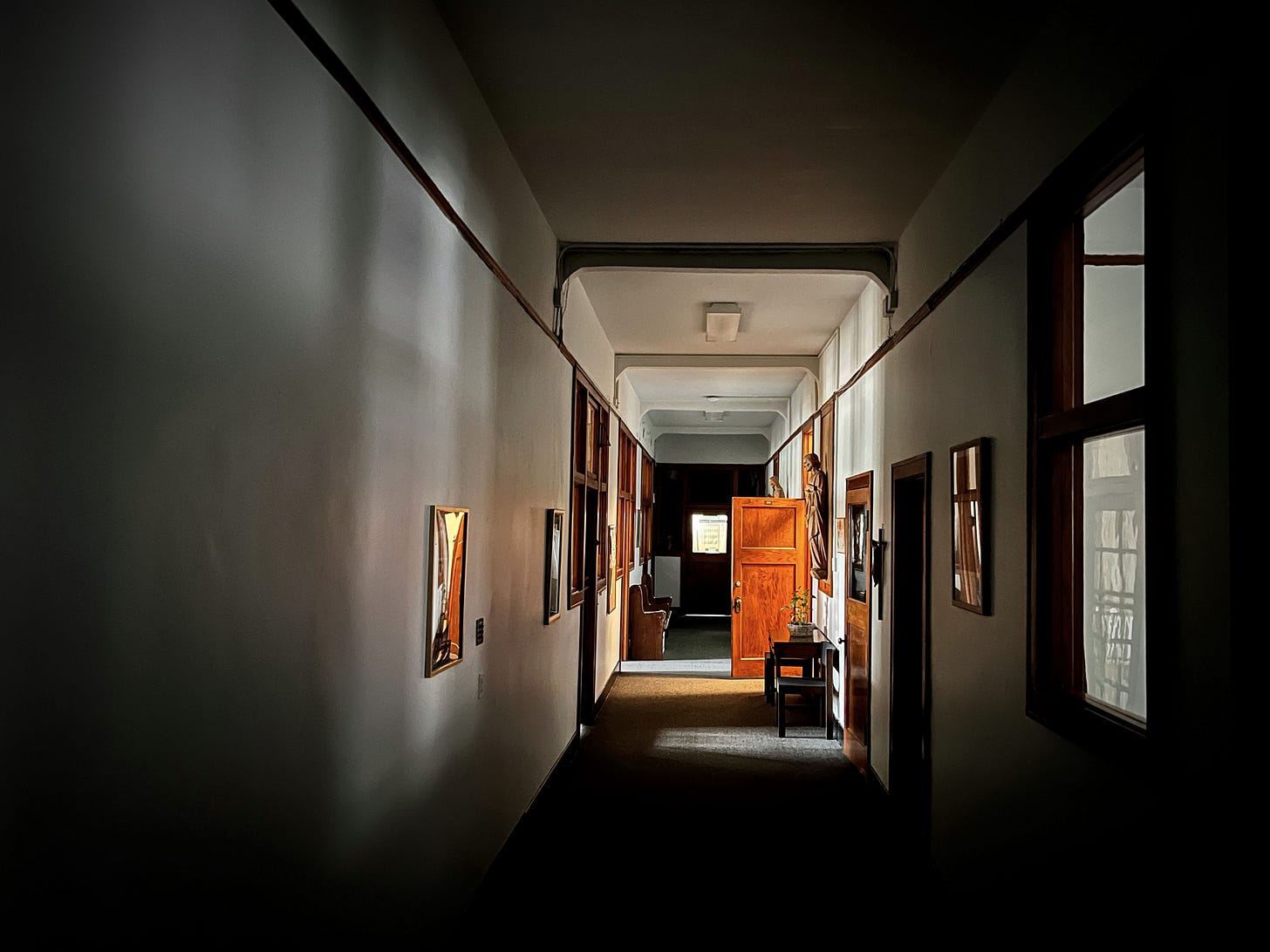 After two slices, I’m more or less done. I could eat more, but I’m satisfied for now. We head back outside and grab my stuff from the car, and after hauling it up three flights of stairs, Father Michael shows me to my room. Well, not just a single room. It’s a suite — a bedroom, a bathroom, an office, and a living room. It’s a fantastic setup, and more than I could have hoped for. Once that’s done, we go on a tour of the property that will last another couple of hours.