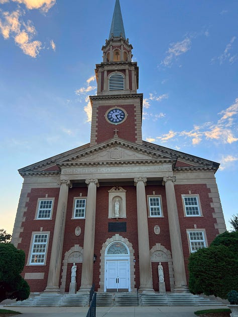 The parish where I’m staying is about a mile away. I never got a name for the church, just an address, and the instruction to head towards the four-car garage at the north end of the parking lot.