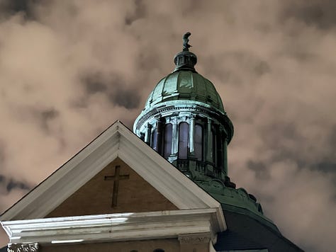 Over the course of the evening, the sky had grown increasingly overcast, and the thick cloud layer was reflecting the city lights with an eerie, orange-brown glow. The lighting on the church created a kind of chiaroscuro effect, and the structure stood in stark contrast against the mottled sky, creating a gothic-noir ambience that was oddly on the nose. I made my way up to the rooftop deck and tried to get some drone photos, but there was a lot of helicopter traffic for some reason, and whichever agency was behind it must have been jamming the signal. I couldn’t fly the thing more than 100 feet or so away in any direction without losing connection completely. On a clear day, under normal conditions, it has a range of up to a mile.