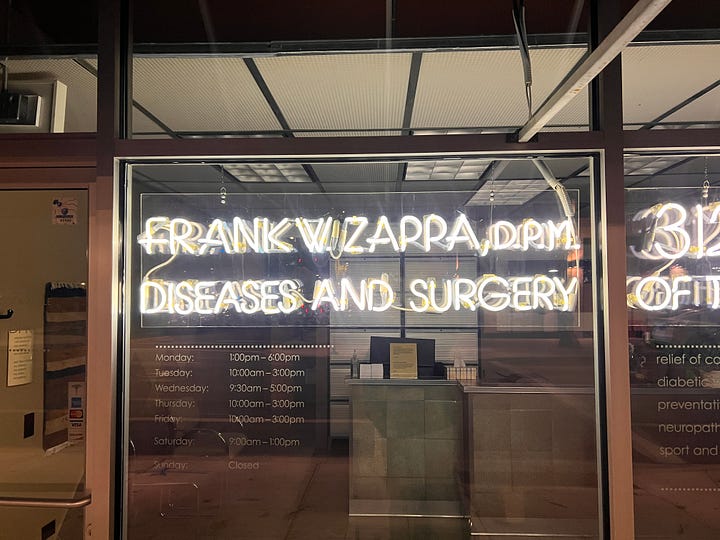 Still, I was struggling. One night, on one of my walks, I poured a little whiskey into my Yeti mug and fired up a cigar. I walked the same route I always did, past the library, the little boba shop, the neon sign for Frank Zappa the doctor, not the musician, all the little architectural quirks up and down Taylor Street. It was finally getting cold after a long, mild autumn. As I walked, it started to drizzle.