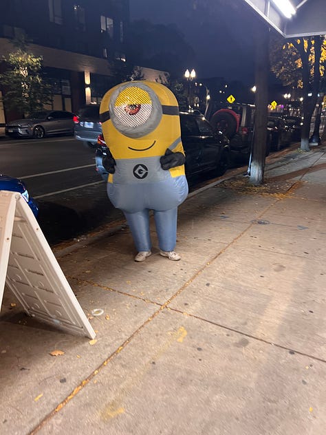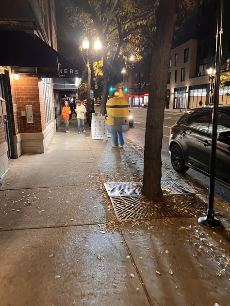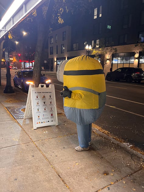 On my walk back, I passed a very busy Boba Tea shop called Gathers. A guy in an inflatable minion costume was standing near the curb, trying to attract business to a place that could barely fit anyone else inside. I ordered a Hong Kong tea and tried to stay out of the way of a throng of mostly foreign college kids inside the tiny store, taking selfies together in their costumes in front of a Halloween-themed background on the wall.