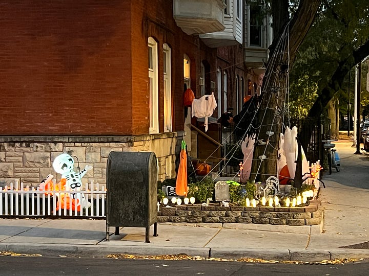At night, sometimes, I’d take walks into the city, just to get away from the desk where I’d been sitting all day. On Halloween, I ventured out, not having any idea what I’d hoped to find. A little girl in a pink and purple princess dress and tiara came running towards me down the sidewalk at full tilt, her parents struggling to keep up with her manic quest for candy.