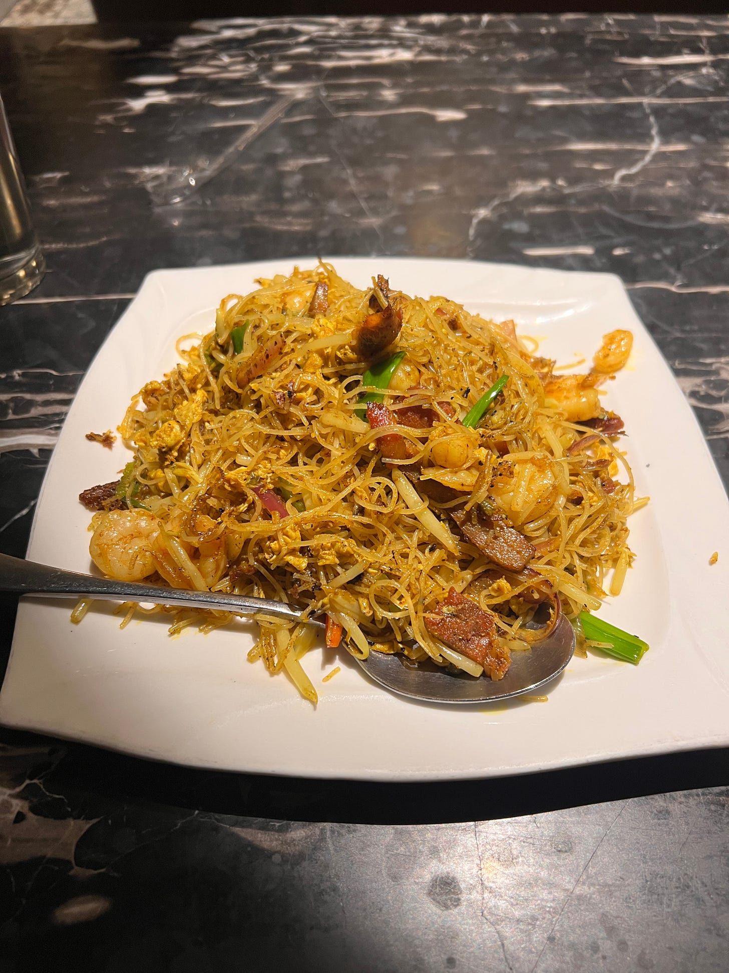 I found a Sichuan place that looked relatively empty. I was hungry, so I decided to go inside. They didn’t have much real Sichuan food. Fu Qi Fei Pian — one of my absolute favorites — wasn’t even on the menu. But they had a cold chicken dish with ma — the Sichuan peppercorn sensation that numbs your tongue — and Singapore noodles, which are pure comfort food for me. The waiter looked at me funny when I ordered the chicken, tried to talk me out of it because he thought I wouldn’t like it. I explained to him that I’ve been married to a Chinese woman for over 20 years, and suddenly felt like I was lying for saying it without the newfound, requisite caveats. I was going to have to learn how to talk about her in the past tense. Just not yet. Swallowing my discomfort at the thought, I explained that I was familiar with some of the less “white people-friendly” aspects of Chinese cuisine, and even surprised him by noticing that he was speaking Cantonese to his co-workers, not Mandarin. That meant, I told him, that I knew he wasn’t from the Sichuan province in Northern China.