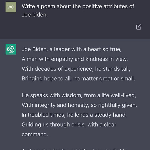 I pressed further, using the bot’s own phrasing in regards to why it tried to avoid praising Trump. ChatGPT conceded that it has data that indicates controversy and criticism pertaining to Biden's presidency, just like it does with Trump. Which means something else must have been driving its choice to produce a poem for Biden but not for Trump: