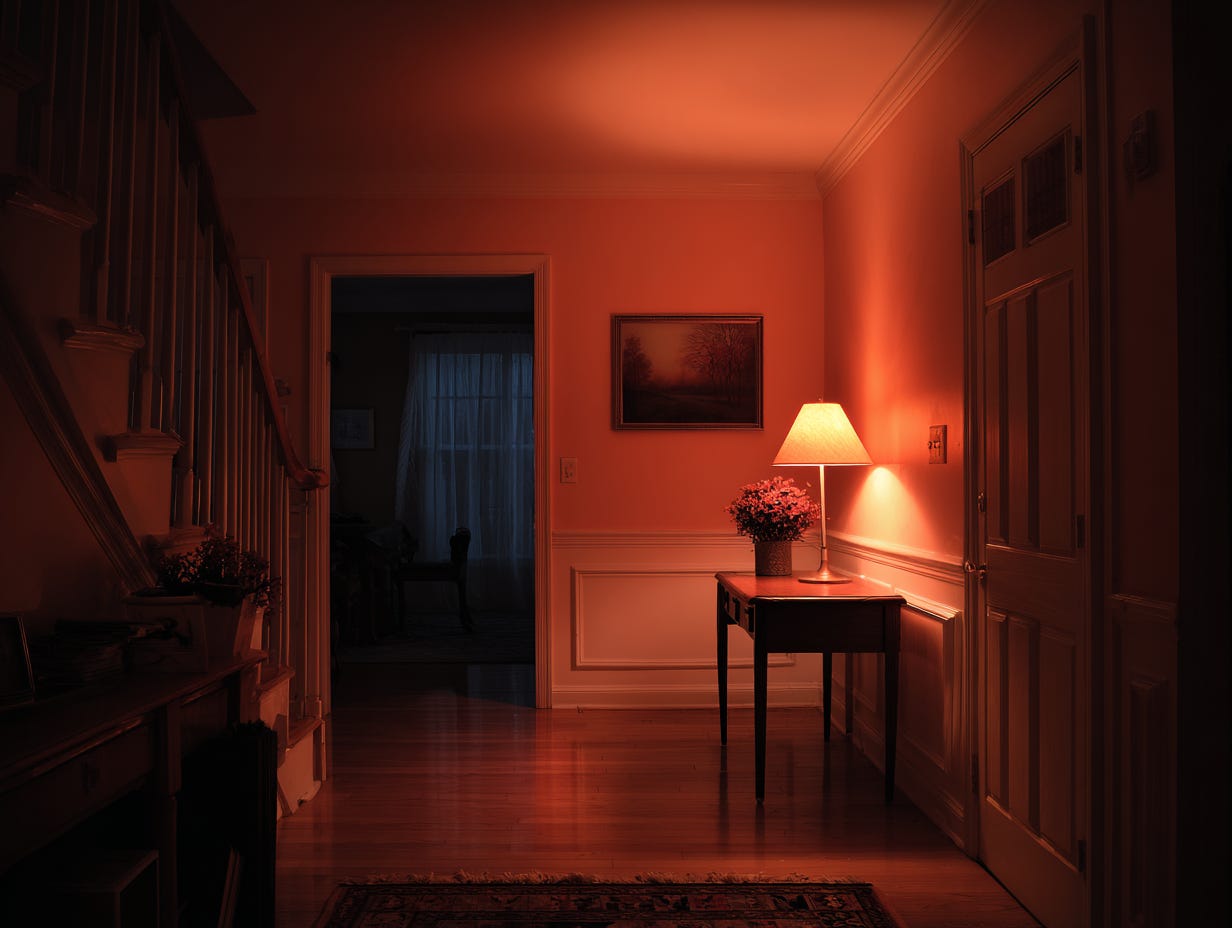 My Airbnb for the night was a small bedroom inside a fairly large suburban home. I followed the instructions for entry, and found myself in a foyer lit by the soft, orange glow of a single, low-wattage bulb, oozing its barely-sufficient luminescence from a table lamp.