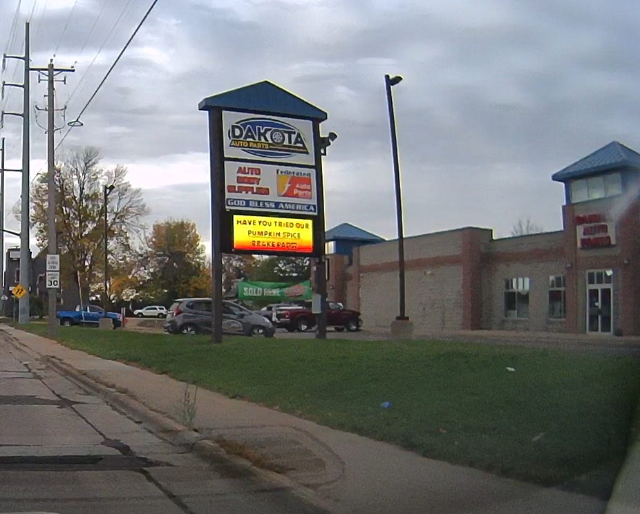 En route to the breakfast place, I get a look at Sioux Falls proper. It’s a fairly dingy town, but there’s a good bit of upscale here too. I see a shop called Dakota Auto Parts with a digital marquee that asks, “Have you tried our Pumpkin Spice Brake Pads?” I find this far more entertaining than I should, and go out of my way to get a picture: