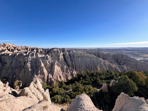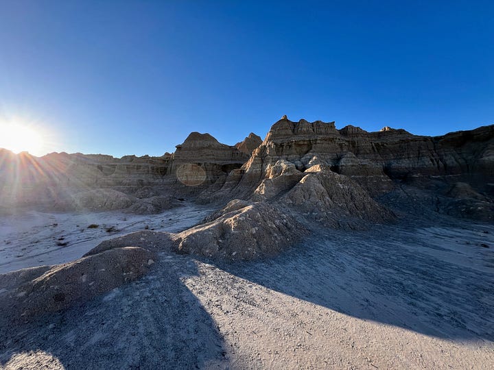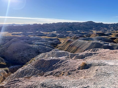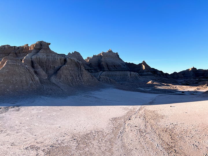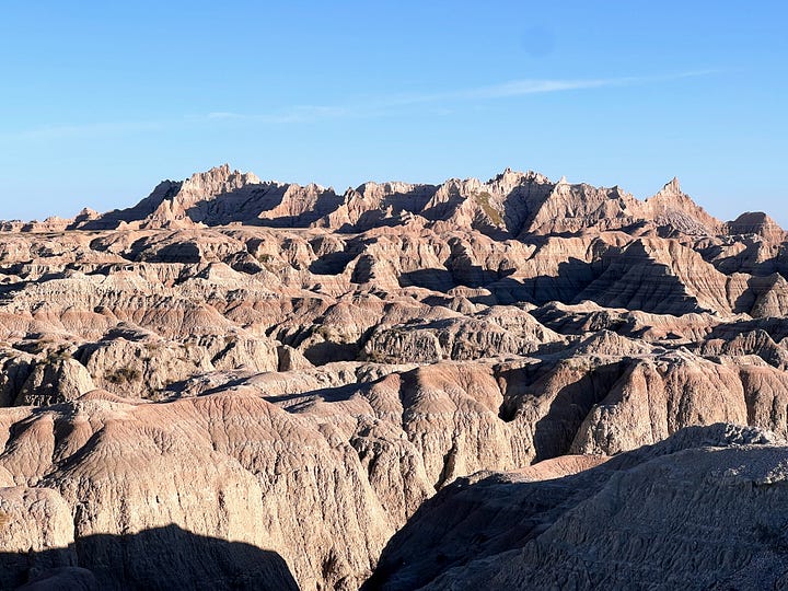 Just a few miles after Wall Drug, I enter The Badlands National Park. I’ve been there multiple times. It’s never been my favorite, but something draws me there all the same. The stillness. The surreal quiet. The alien landscape. The mystery. I came West to face solitude and find grace in nature, and this is the first step into that purpose.