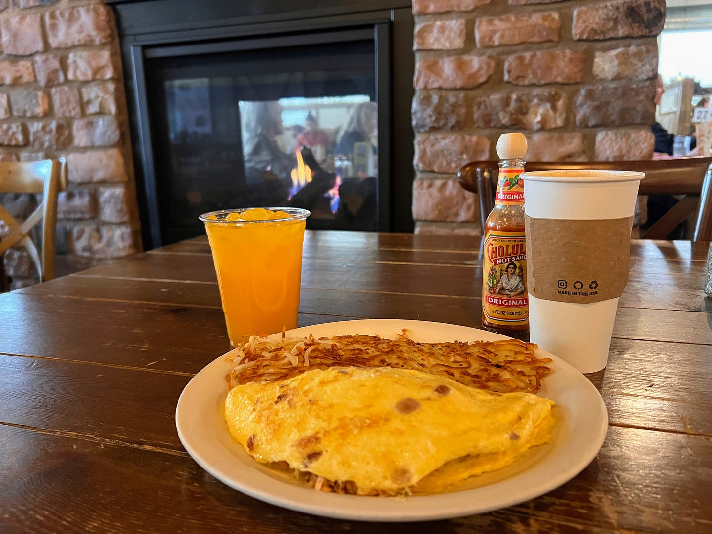 Unlike most sit-down restaurants this size, everything is ordered at the counter. Then then you get a number on a stick and find a seat, and wait for your food to be delivered. I go with a blackened salmon omelet, hashbrowns, a latte, and a glass of fresh-squeezed orange juice. After forking over a 10th of a car payment, I grab my little number 12 on a stick, and find a spot at a long table just in front of a stone hearth with an actual fire.