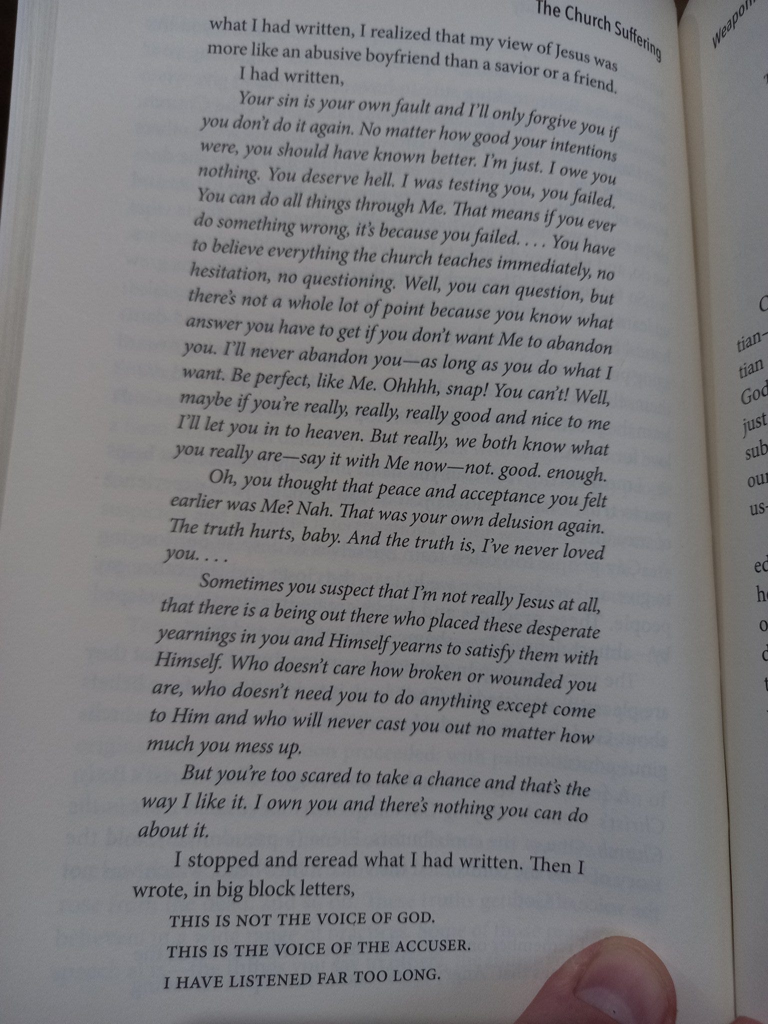 I feel as though concluding that these kinds of thoughts represents listening to "the voice of the accuser" is an obvious coping mechanism. It's the thing you have to tell yourself if you're desperate to keep believing.