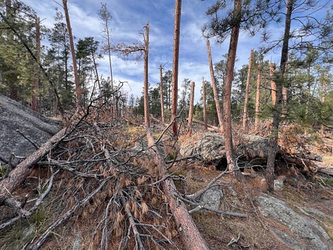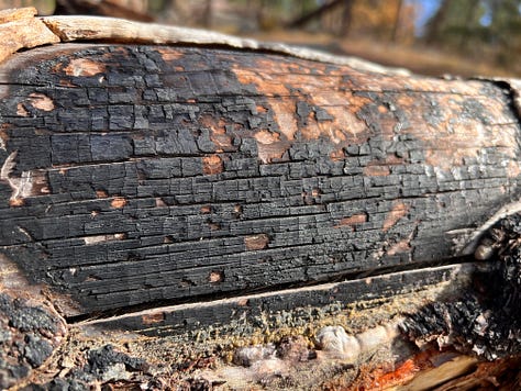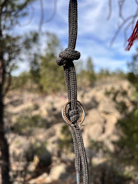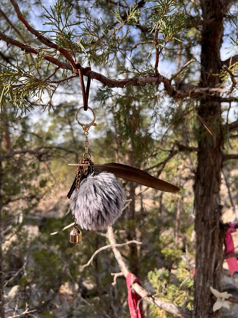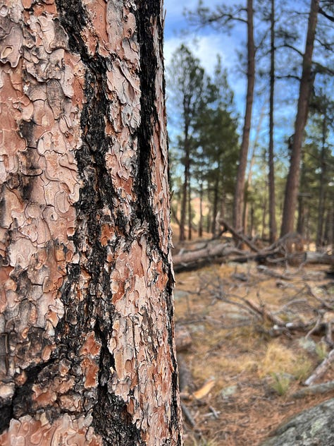 The trail around the base of the tower is paved, and fairly easy going. It winds through a forest of ponderosa pines, many of which have fallen or otherwise been burned in what must have been a significant forest fire. The trees are festooned with scarves and hair ties and various other forms of ornamentation, which I don’t understand until I come across an explanatory plaque along the trail. It reads: