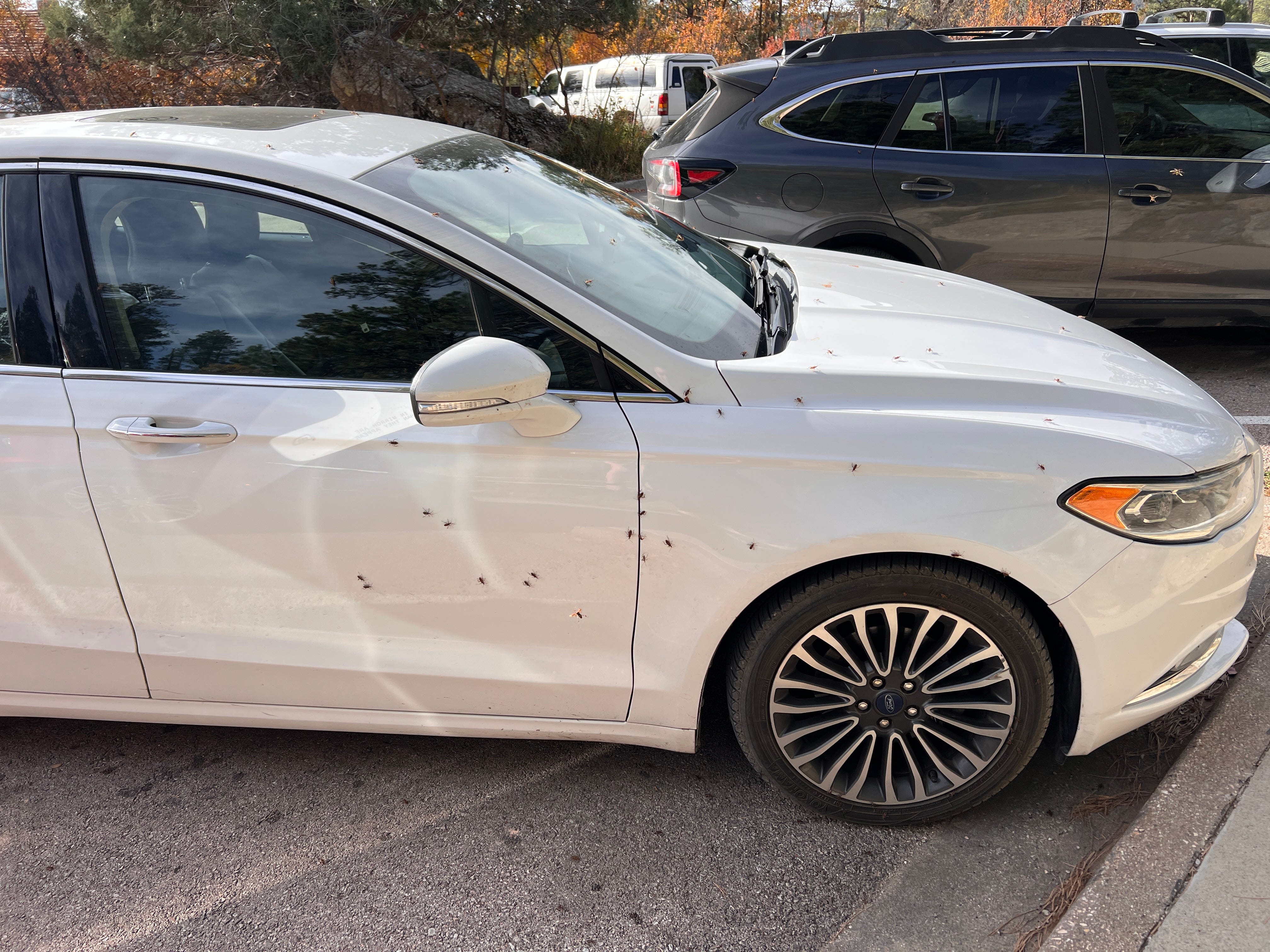 I use my shoe to knock a half dozen box elder bugs off the driver’s side door of my car and quickly climb in, hoping none follow me inside.