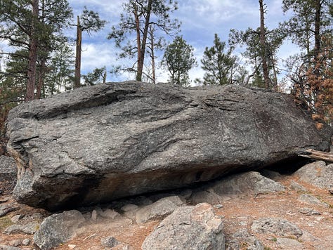 Highway 14, picked up out of Sundance, is a long and winding two-lane road into the Black Hills Prairie. Before long, my cell signal downgrades from 5G to LTE to SOS to nothing at all, and I lose connection to my podcast stream right as it’s getting interesting, so I drive in silence instead.