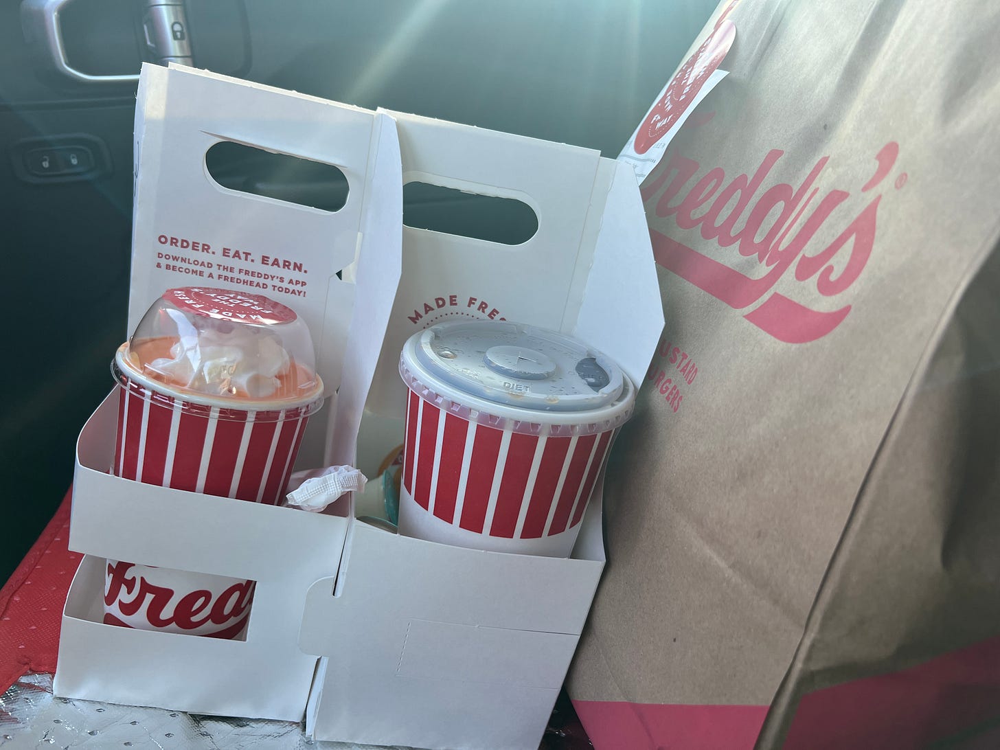 The next order is from a burgers and custard kind of place, and though I’m supposed to verify what’s on the receipt with what’s on my screen, it’s a big bag and when the girl tells me, “That’s everything!” I decide to just believe her. I make my way back to the handicap spot I borrowed because there was no other parking, and just as I’m getting ready to pull out, another young lady comes running out of the shop with a couple of milkshakes that were supposed to be included.