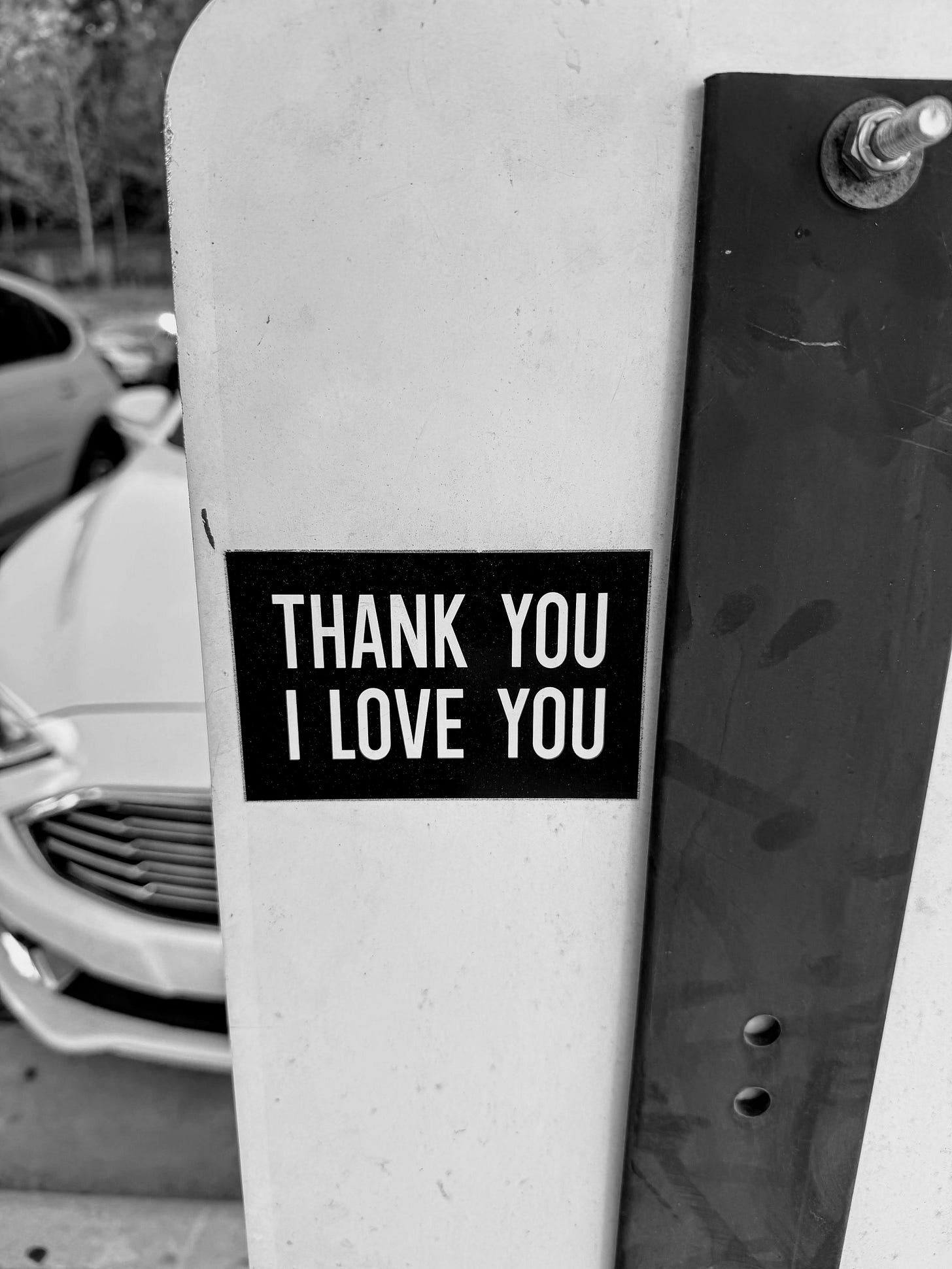A parking lot sign has a sticker on the back that says, “Thank you, I love you,” and I wonder how long it’s been since I heard a sentence anything like that.