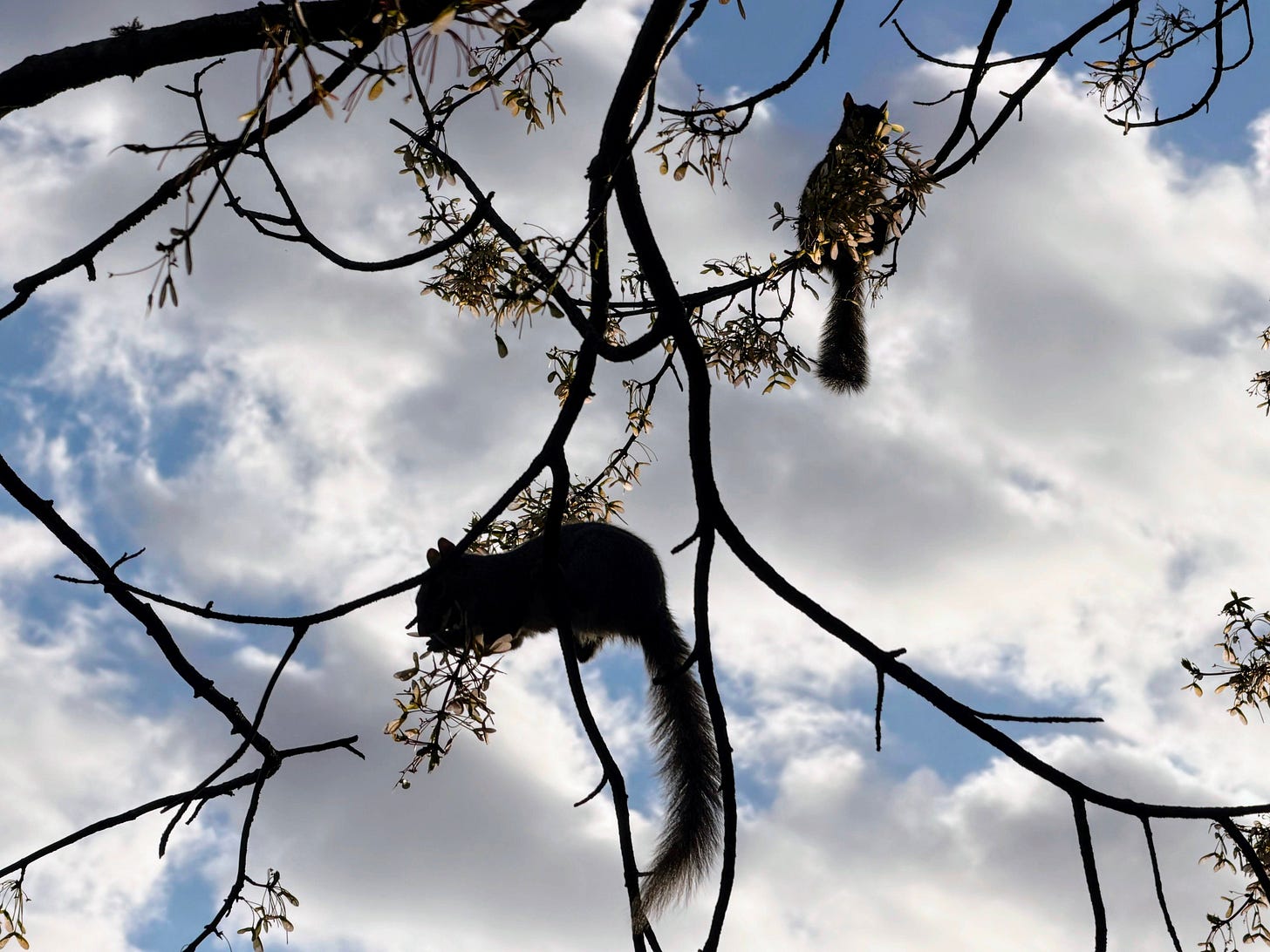 At another stop, two squirrels are busily gnawing on the new buds on a tree, indifferent to my approach.