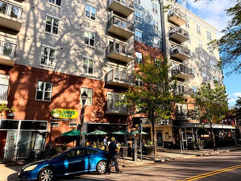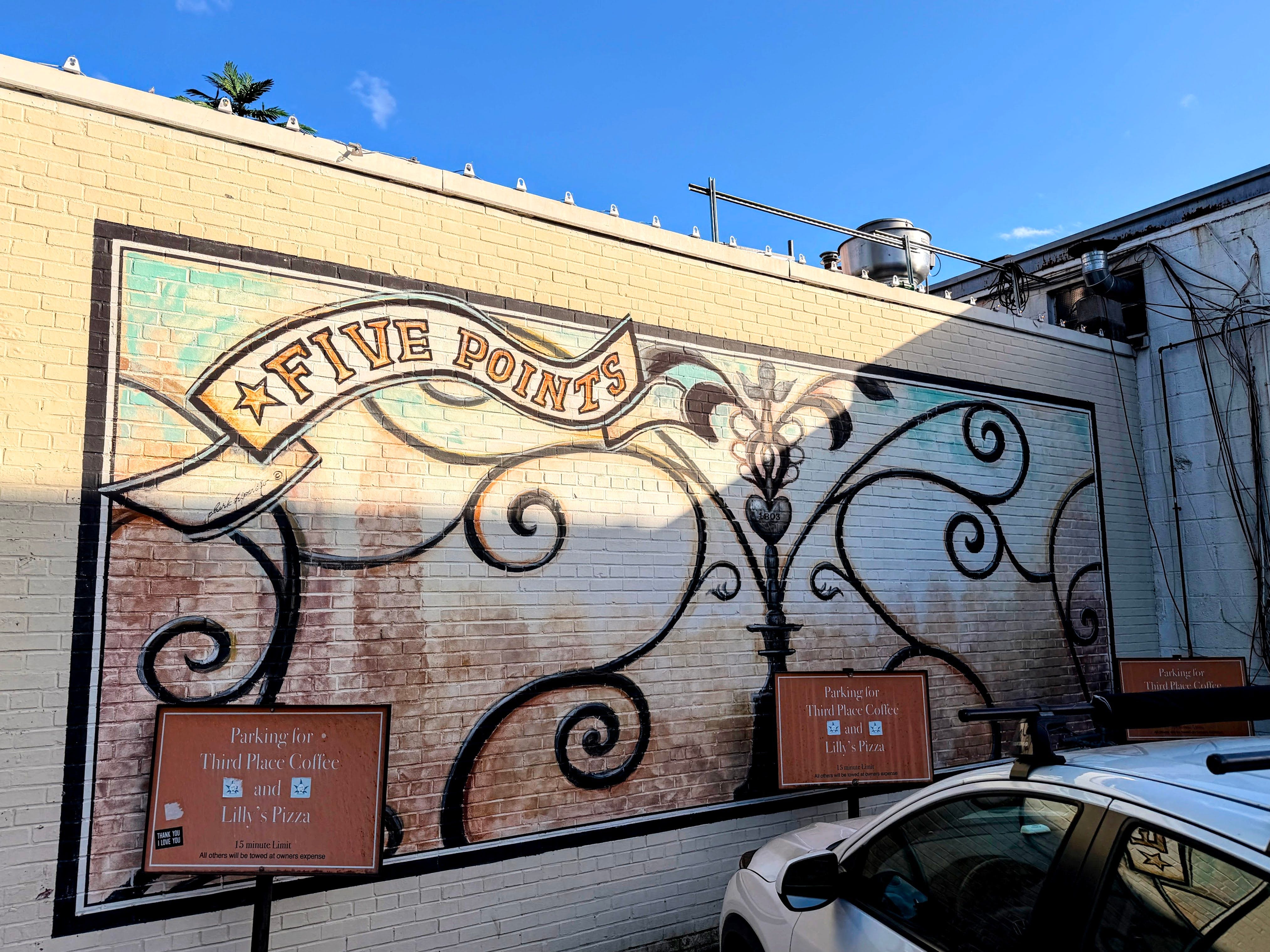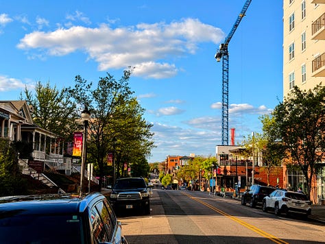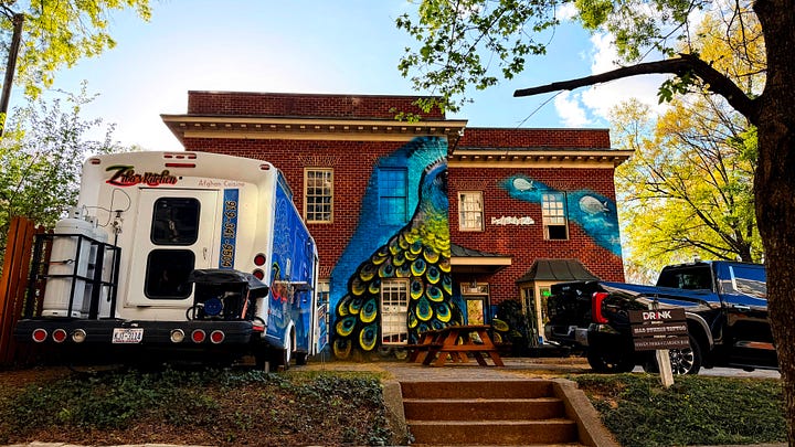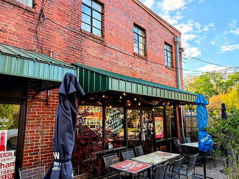 I turn my chosen app back on — it’s DoorDash tonight — and instead of getting an order from the long row of restaurants just a hundred yards or so to my right, I get something further away, towards downtown. Before long I’m cruising down Glenwood Avenue past rows of well-kept American Foursquare and Georgian Revival homes, charming and quaint, and flip a U-turn to head into a pizza place nestled in an old brick building in Five Points — an intersection of neighborhoods with a kind of retro-modern vibe.