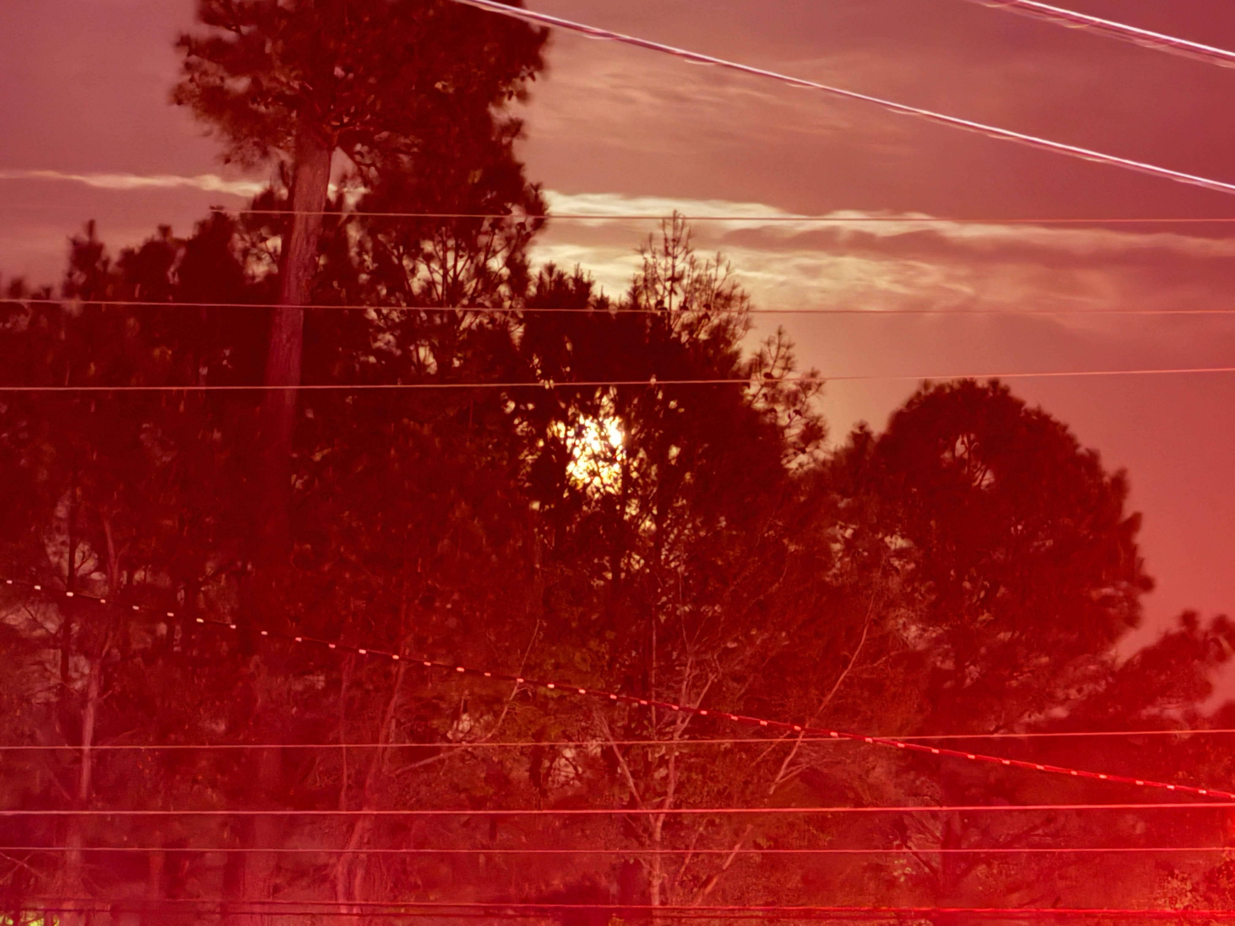 The night wears on. The moon is bright. I try to snap a shot from my car at a red light, but my phone’s automatic selection of a longer exposure means I pick up way too much ambient glow, creating a surreal image, crisscrossed by an absurd number of powerlines, that for some reason I admittedly kind of love.