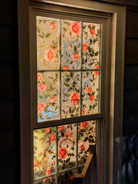 I drop a delivery on the dimly-lit porch of a bungalow, the glow of lamplight from within illuminating a window done up entirely in pink roses. I’m not sure if it’s stained glass, or painting, or a combination of the two. Either way, it’s style I’ve never seen.