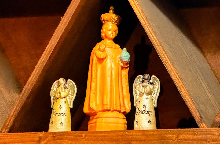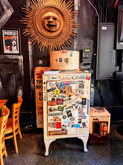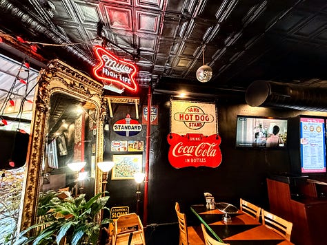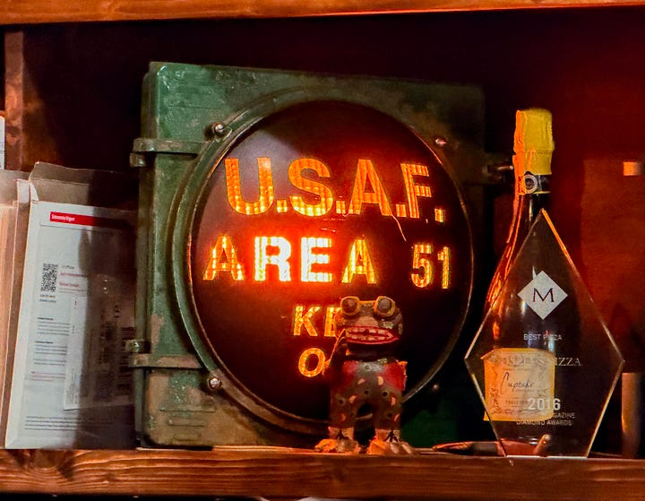 A collection of reproduced old brand logos, ranging from Coca-Cola to Standard Oil, stamped on tin, lines one wall under a disco ball and the glare of a neon Miller High Life sign. The opposite wall has what I think is an antique icebox covered in stickers, beneath a garish, gold-painted sun medallion with no eyes. On shelves near the bar, an illuminated Area 51 sign, convex and set into green metal framing, catches my attention where it sits just below a waxy-looking statue of the Infant of Prague, flanked by ceramic angels that bear inscriptions reading “Peace” and “Dream.”