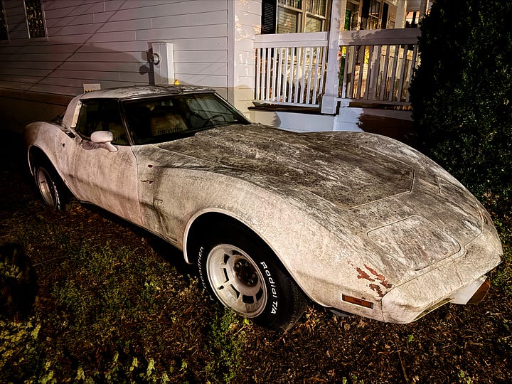 Another drop-off puts me in the yard of a house with an old, weathered Stingray Corvette in the drive and a sign on the beat up door offering tax services. I can’t tell for sure if it’s been abandoned, but it feels that way.