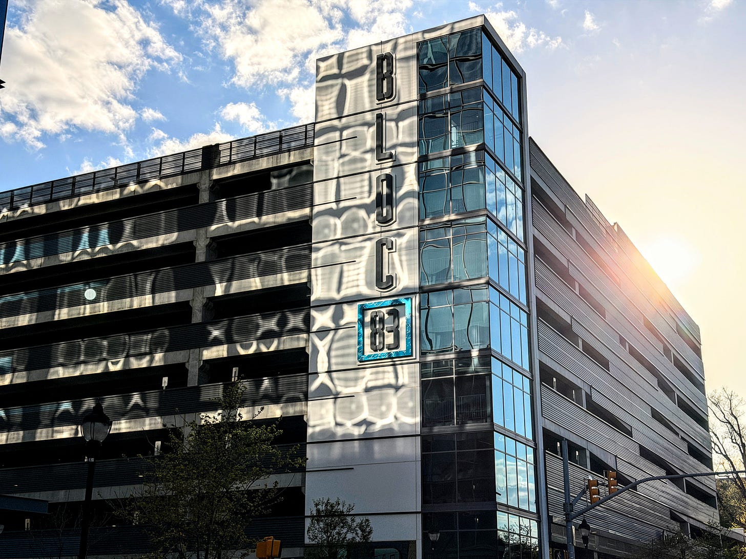 A building so reflective it shines like a mirror in the waning afternoon sun is labeled “Block 83.” I can barely look at it with the glare in my eyes. Only later, when I review the photo I managed to snap out my driver’s side window, do I realize it’s probably a parking garage.