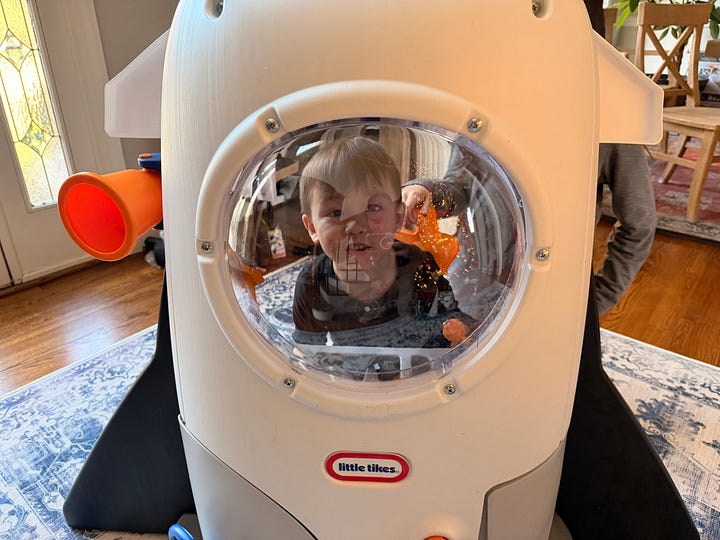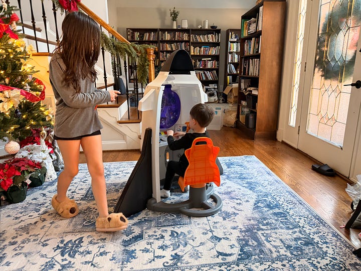 I did get to spend Christmas with my kids yesterday, although I missed out on seeing them open any presents I didn’t bring. Then most of them took naps for half the afternoon because like the silly teenagers they are, they’d been up all night. Only the little ones stayed awake. It was weird, though, spending the whole day at the place that used to be my home. Everything peaceful. Nothing weird. I spent about an hour putting together the rocketship playset for Eli, my 4-year-old, with the help of Mia, my 10-year-old. (Truth is, Mia, who is obsessed with space, just like her dad, seems to be enjoying it even more than Eli is.)
