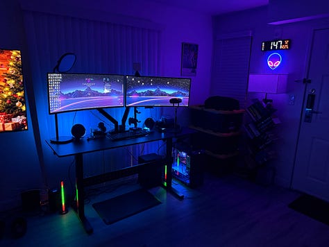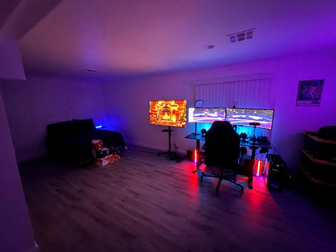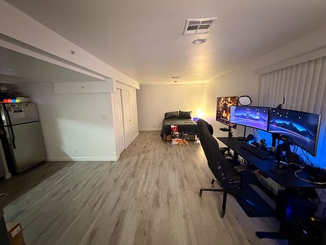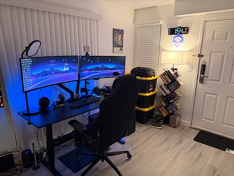 Very spartan. Very “bro-coded,” as the cool kids right now would say. I don’t need much. Just a little more storage, a place to sit, maybe some more shelves. I have a folding table and a folding chair I use for eating, when I don’t just eat at my desk.