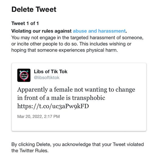 How about another example that I came across during my current Twitter jail time? How is saying that “Apparently a female not wanting to change in front of a male is transphobic” even conceivably defined as abuse?