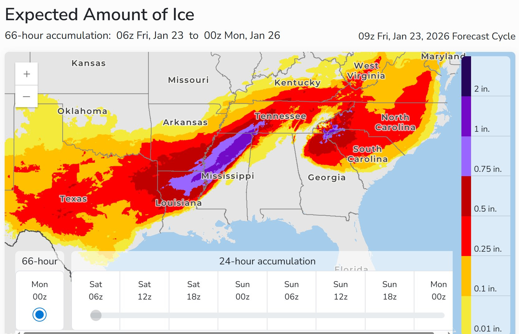 The image above shows areas of just ice accumulation, not snow. I’m smack in the middle of the red zone. They say that just half an inch of accumulated ice can add hundreds of pounds to individual power lines and tree branches, causing Hurricane-level damage and long term power outages, right as the Polar Vortex is driving nighttime temperatures well below freezing and daytime temperatures colder than is normally seasonable.