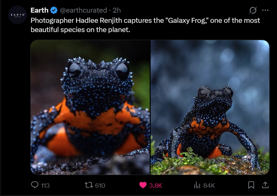 Yes, the photos in that X post (credited to Hadlee Renjith) appear to be real photographs of the actual Galaxy Frog (Melanobatrachus indicus), not manipulated, photoshopped, or AI-generated.The species is well-documented by scientists, conservation organizations (like the Zoological Society of London and IUCN-affiliated reports), and citizen science platforms such as iNaturalist, where verified observations include photos showing the exact same distinctive features: jet-black skin with iridescent blue/white starry spots on top and bright orange/reddish underparts…