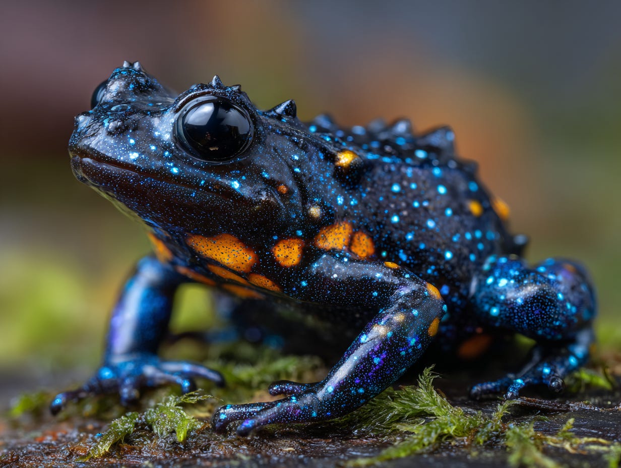 Yes, the Galaxy Frog (Melanobatrachus indicus) is a real species of frog native to the wet evergreen forests of India’s Western Ghats. It’s a rare, endangered amphibian in the Microhylidae family, known for its starry black skin with iridescent blue spots and orange underbelly…
