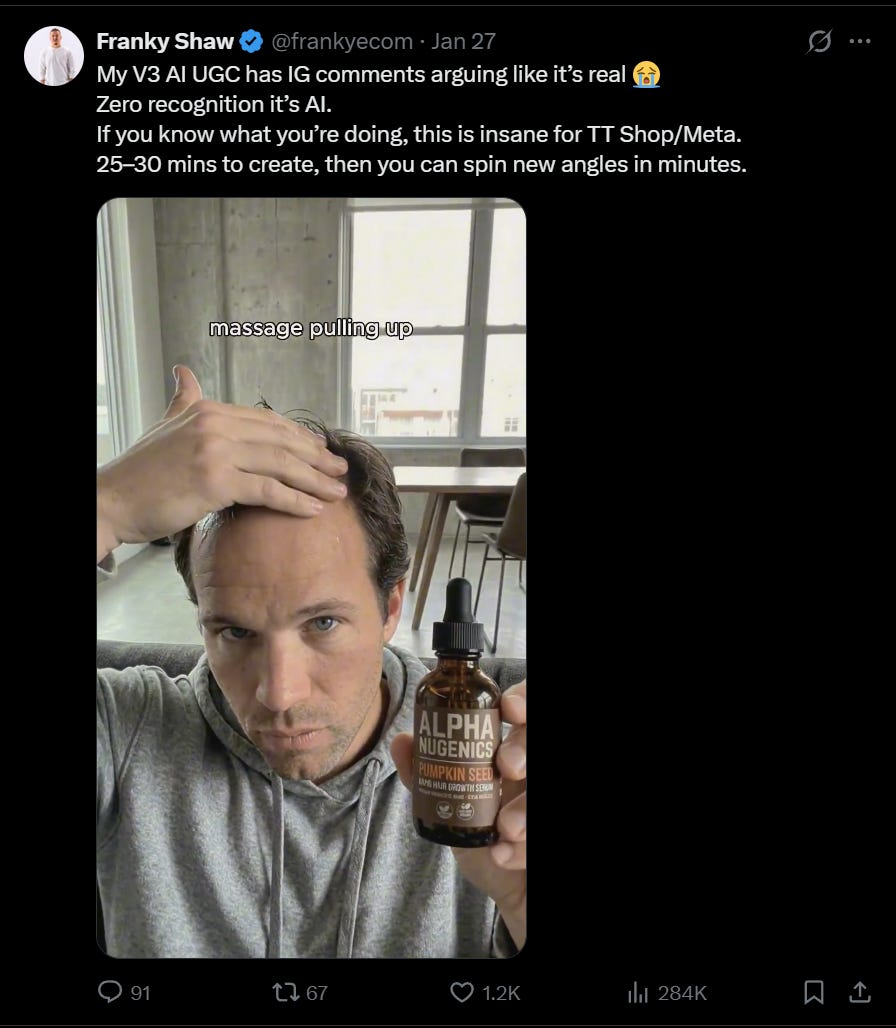 But there’s an increasing amount of “is it real or not” content coming up, and it’s getting harder and harder to tell. For example, this UGC (User Generated Content) social media ad for pumpkinseed oil, of all things, for hair regrowth: