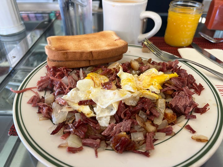 I grabbed more coffee, a little fresh-squeezed OJ, and a plate of corned beef hash with two eggs, over easy. They even had gluten-free toast. The service was fast, the food was incredible, and the guy behind the counter reminded me of a young Matthew McConaughey without the Texas drawl. The timbre of his voice even sounded eerily similar. He never stopped hustling for even five seconds the whole time I was there, but he looked to be enjoying himself. At one point, he finished pouring a bag of fresh coffee beans into a hopper and then buried his face in the bag.