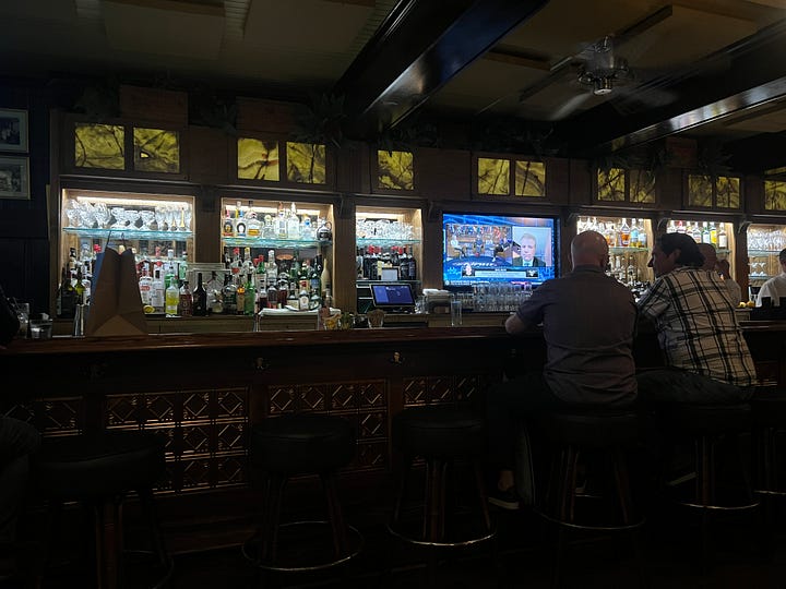 Inside, it was dark and loud, the majority of tables lined opposite a long wooden bar, stained a deep mahogany hue and plated along its length with copper-colored stamped metal sheeting. The overhead fixtures were dim and dingy, so most of the light came from the backlit liquor alcoves, punctuated by the glow of flatscreen televisions, tuned to different news channels and sporting events. I was seated and given a menu, but I knew what I’d come for, and didn’t deliberate for long.