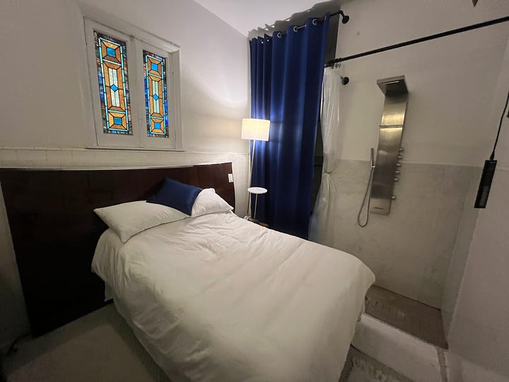 In the morning, I packed up, and spent 20 minutes trying to figure out how to work the shower with its half-dozen knobs and spouts, all while hoping to keep the water contained within the curtain — the only barrier between it and the bed.