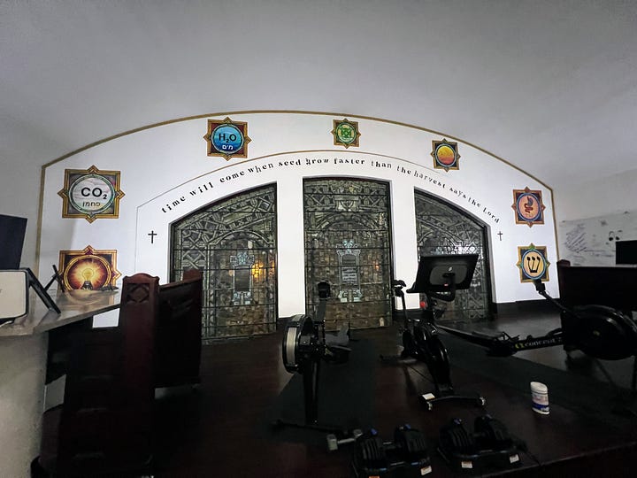 I went back to my car and got my stuff. I was unsure about the safety of the neighborhood, so I grabbed my camera and other valuables I didn’t actually need for the night. Once my things were settled into the room, I decided to do a little exploring. In various areas within the building’s cavernous common spaces, bright grow lights fed collections of green plants the researchers were studying to find nutritional approaches to the problem of ADHD in space — which is a very funny phrase when you say it out loud.