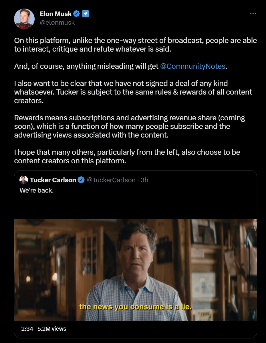 Interestingly, Elon Musk has already made clear that Carlson chose to make this move independent of any incentive or deal: