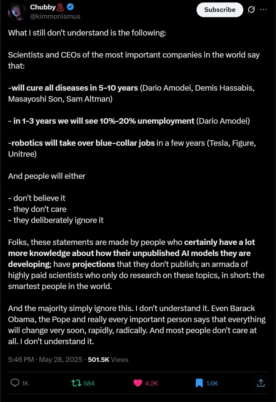 I should note that I’m also seeing AI hype accounts (often referred to as the e/accelerationist crowd) making loud noises about how the government and the AI industry need to get together to come up with a solution quickly, or the disruption is going to cause very big problems across society. Lot of people talking about taxing AI wealth to create some kind of Universal Basic Income (UBI) for all the folks who will be put permanently out of work by the AI takeover. One example: