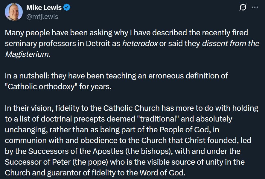 To contextualize, Lewis is speaking here of the abrupt and unjust firing of Dr. Ralph Martin, Dr. Eduardo Echeverria, and Dr. Edward Peters from Sacred Heart Major Seminary. The firing came on the orders of Edward Weisenburger, the new Archbishop of Detroit.